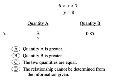 3. Quantitative Comparison: These questions compare two quantities and ask you to determine the relationship between them. You need to determine if one quantity is greater, less, or equal to the other, or if the relationship cannot be determined from the information given.