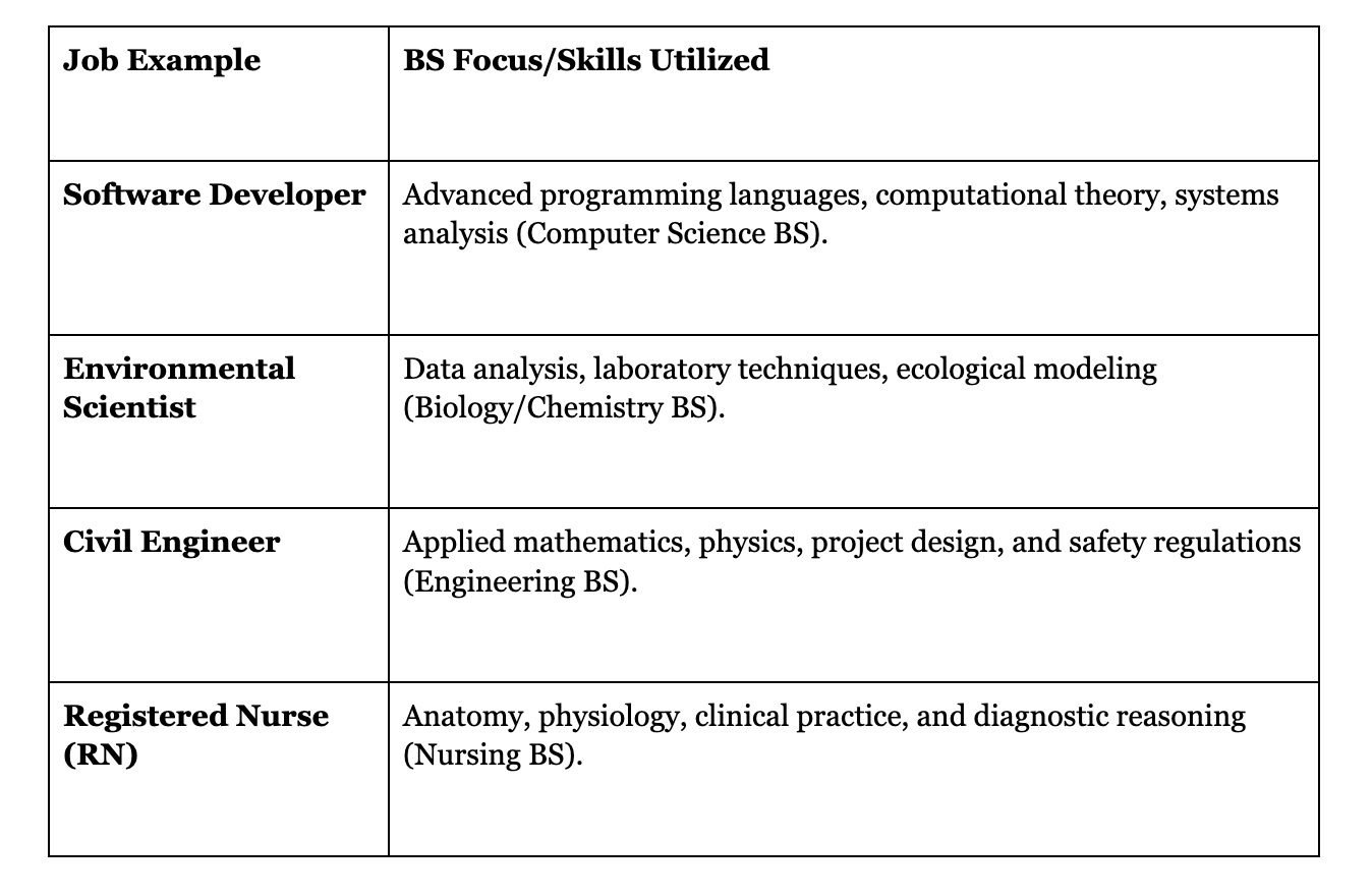 A BS degree is designed for roles that require a strong, specialized technical foundation. These roles often involve research, design, analysis, and hands-on application of scientific principles. You’re likely to be working in STEM, or something closely related.