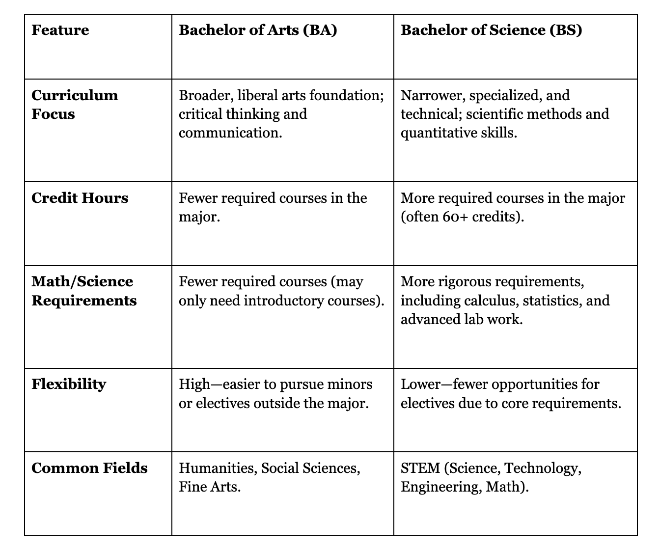 The main distinction between a BS vs BA generally comes down to the focus and intensity of the curriculum within the major.