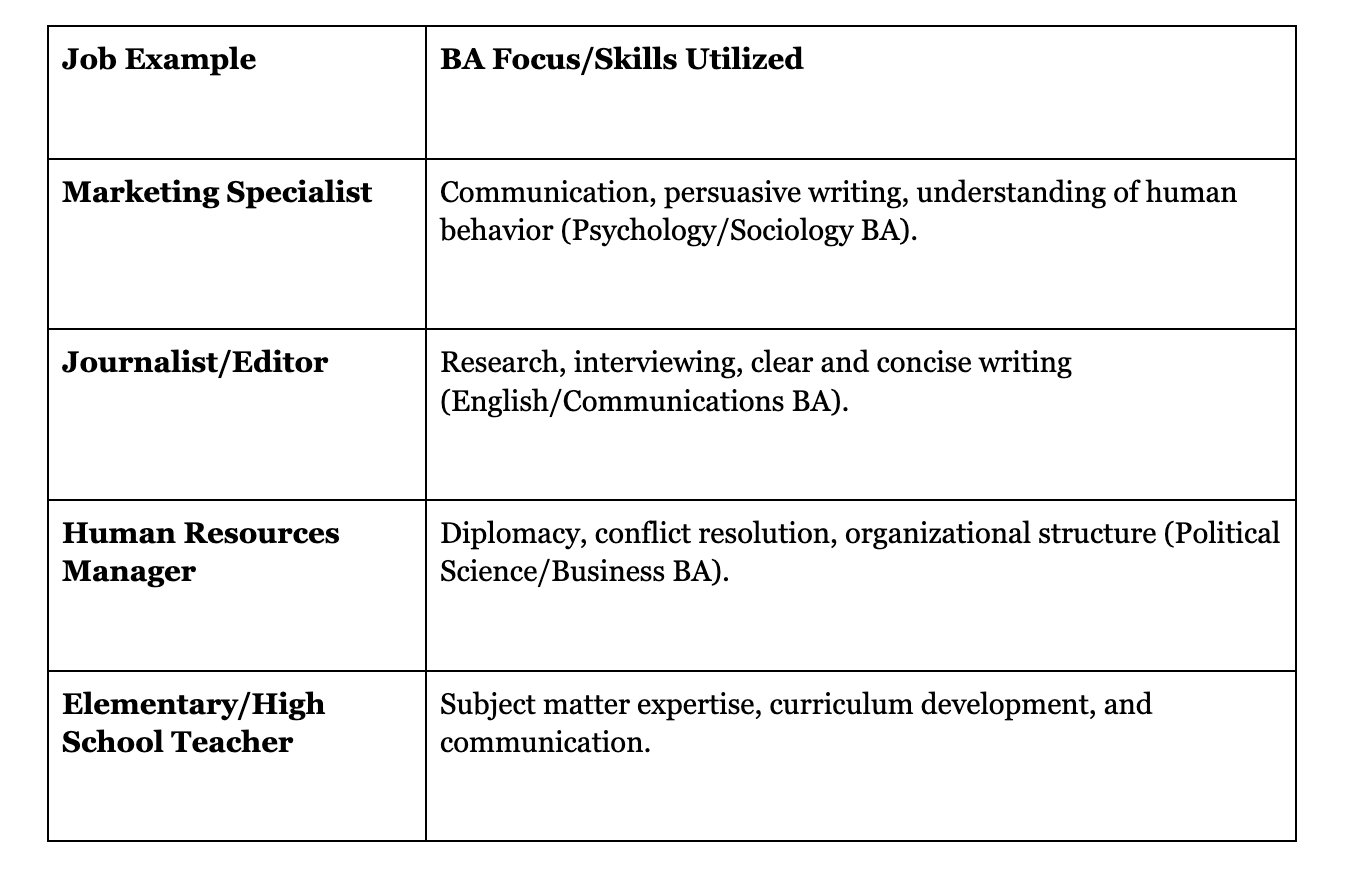 Key Takeaway: a BA is about developing strong critical thinking, writing, communication, and analytical skills that can be applied across many different industries.