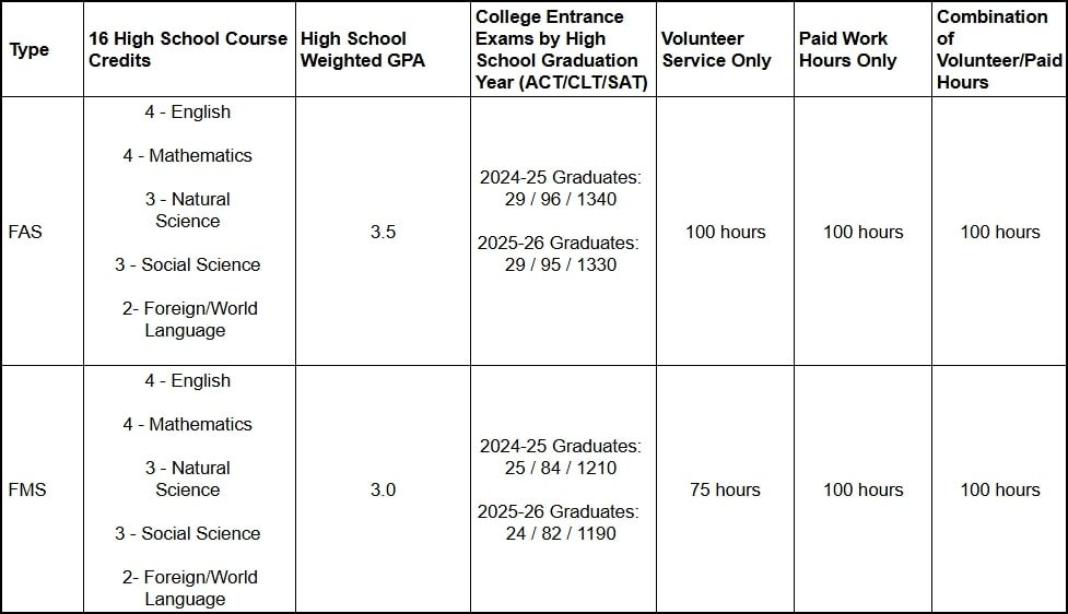 Achieve the required minimum ACT, CLT, or SAT college entrance exam score (see table below). Tests are accepted through August 31 of the high school graduation year.