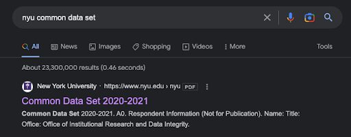 Search for the Common Data Set for colleges and universities in the northeast. You can do this by going to Google and typing in “[x school name] Common Data Set.” So for example, just “Harvard Common Data Set” or “MIT Common Data Set.” We’ll use the Common Data Set for NYU for the remaining steps of this example.