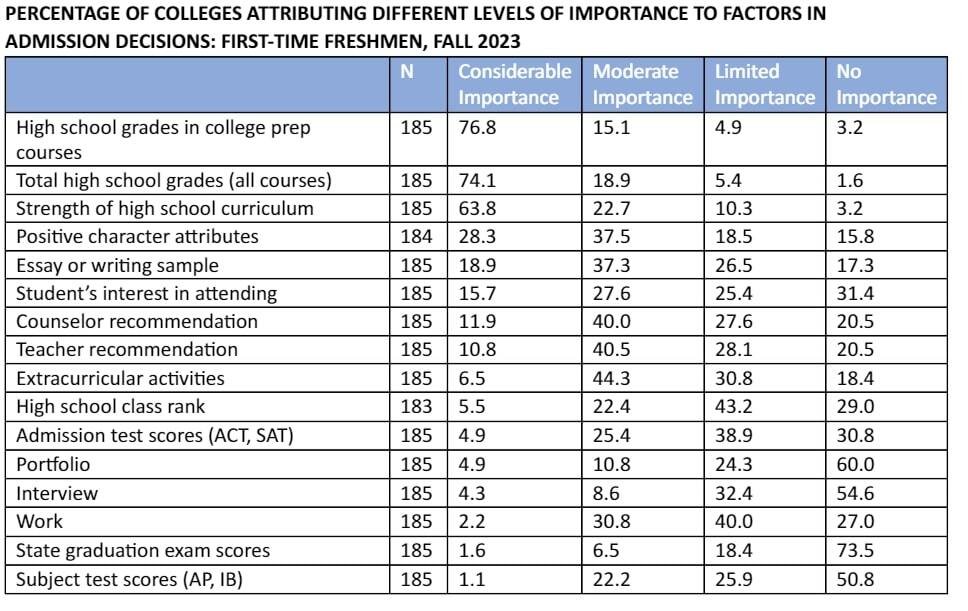 Testing has dropped a lot in terms of “considerable importance” to colleges in recent years—from 46% in 2o18 to just 5% in 2023—as more and more colleges have chosen to go test optional or test free (see that guide for an in-depth explanation).