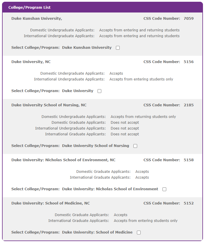 在本部分中,你将找到你计划申请的学院和大学。如果你的学校有 CSS 代码,请务必在此处输入!