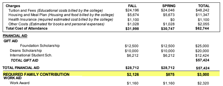 这封奖励信非常清楚地分解了学生的所有在读费用 COA 和奖励。此学院颁发了三项奖学金:戴维斯基金会奖学金、国际学生奖学金和院长奖学金,为该学生提供总计 57,424 美元的援助。该助学金计划中不包含贷款。学生的勤工俭学被标记为“工作援助”,总额为 2,320 美元。