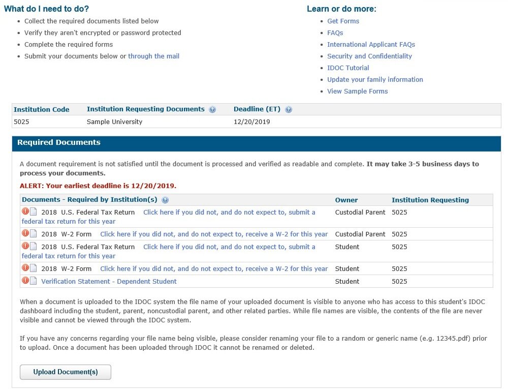 提交《财政援助申请表》后,你可能需要向学校发送证明文件。这就是 IDOC(大学文档服务)发挥作用的地方。需要提交文件的学生将收到由大学理事会发出的电子邮件,其中还包含了 IDOC 提供的登录详细信息。在 IDOC 中,学生将被要求上传你和你的父母税表、银行对账单和/或其他助学金申请文件。请务必在规定的截止日期前提交你的文件!