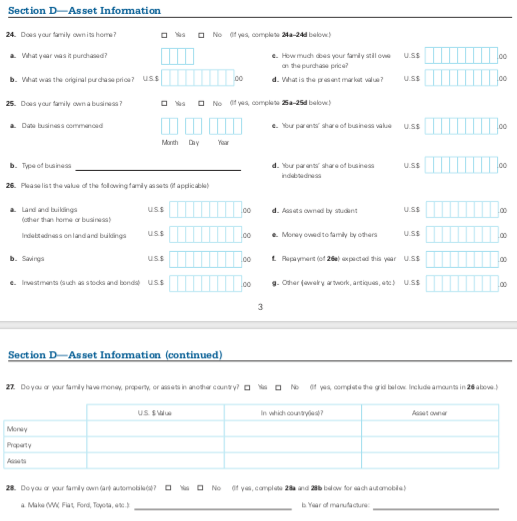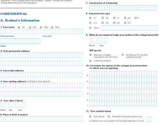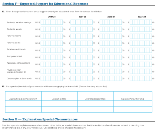 这是一个免费的纸质申请,可在相应学校的网站中下载。学生需要将收入和资产信息转换为美元 (USD),并在申请时提供其他文件。例如,可能需要最近完成的纳税申报表、当前收入记录、未征税收入和福利记录、资产和银行对账单。你的家人将通过此申请向你计划就读的大学提交前一年的收入。