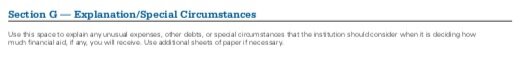 在这两种申请中,都有一个供家庭向大学解释在审查其申请时应考虑的任何特殊情况的部分。在某些情况下,在处理申请时,财务状况可能会发生变化。或者,在提交后发现申请有误。申请人应及时向大学告知任何特殊情况和错误,以便为自己获得援助提供最佳机会。