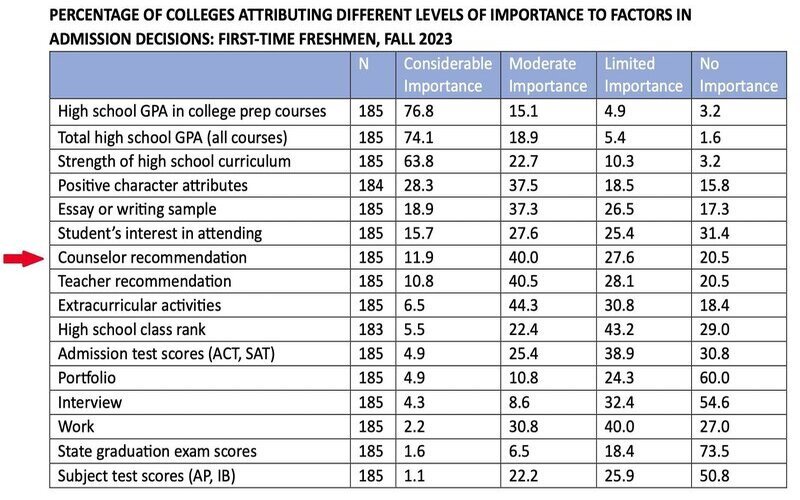 Our buddy Chris Reeves, a member of NACAC’s board of directors, has another way to read this table: “If you consider ‘considerable importance’ AND ‘moderate importance’ … the counselor rec even ranks above the essay.”