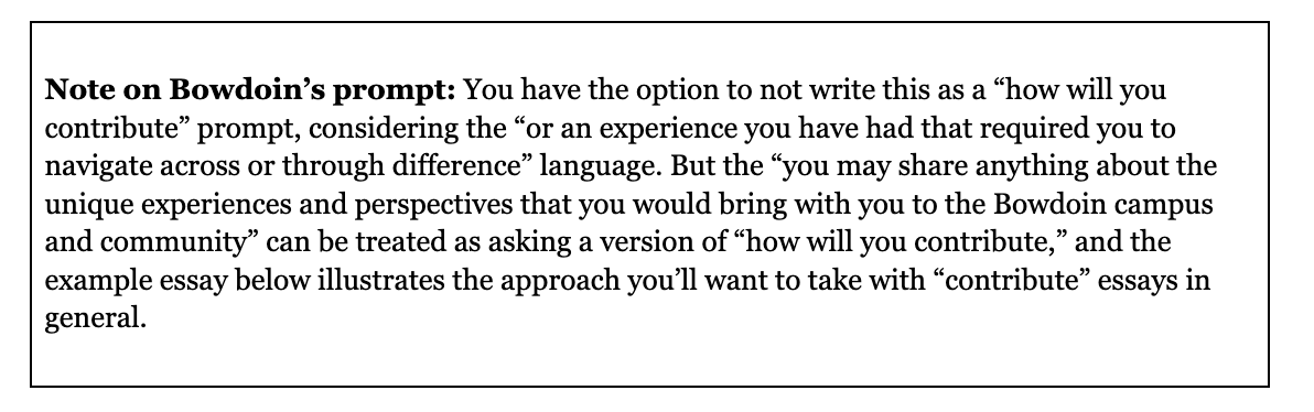 Prompt from 2024 (hey: look up the most recent prompts on the Common App): Bowdoin believes that only through building a more diverse and inclusive campus community will the College best prepare graduates to be contributing and useful citizens of the world. Every graduate of this institution should be confident in their preparation to be able to navigate through differences and in all sorts of situations. A Bowdoin education does not guarantee these skills, but it does impart a set of tools necessary to bravely enter unfamiliar conditions with the confidence to deal effectively with ambiguity. If you wish, you may share anything about the unique experiences and perspectives that you would bring with you to the Bowdoin campus and community or an experience you have had that required you to navigate across or through difference.