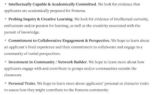 Some colleges, like Pomona, explicitly mention the valued qualities that they look for in students on their admissions website: