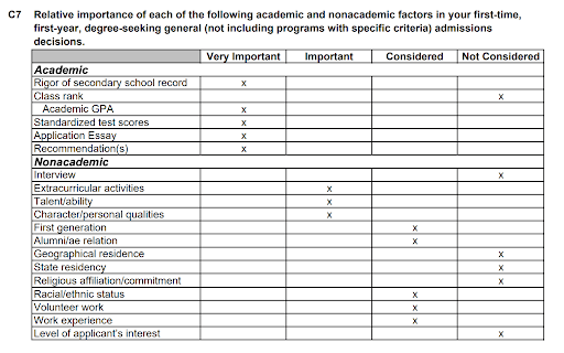 For example: colleges that don’t factor demonstrated interest into their selection process will mark “Not Considered” on the C7, or “Basis of Selection” Section, of their CDS.