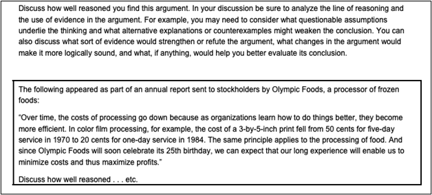 In this section, you will be presented with an argument and tasked with critically analyzing it and constructing a well-structured written response. You’ll need to articulate your thoughts effectively, support your arguments with logical reasoning, and demonstrate your ability to communicate ideas coherently within a time constraint.