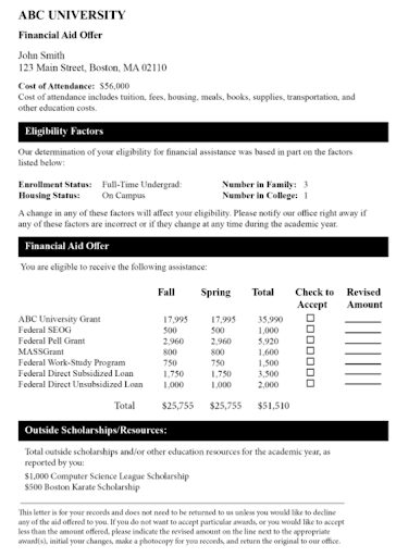 It’s a list of all the different kinds of money—scholarships, grants, loans, work study—you’ve received to go to a particular college next year.